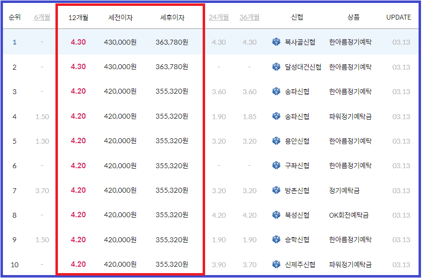 먼저, 6개월에 대해 말씀드리자면 금리 4.20%에는 이미지와 표에 나와 있지 않지만 봉평신협 본점이 있습니다. 12개월 기준 금리 4.20%에는 이 외에 제주서부신협 본점, 함열신협 본점, 행복신협 본점, 순창신협 본점, 해남우리신협 본점, 용안신협 본점, 으뜸신협 본점이 있습니다.