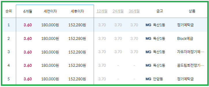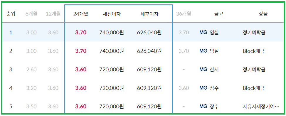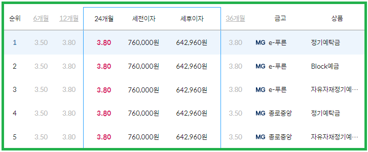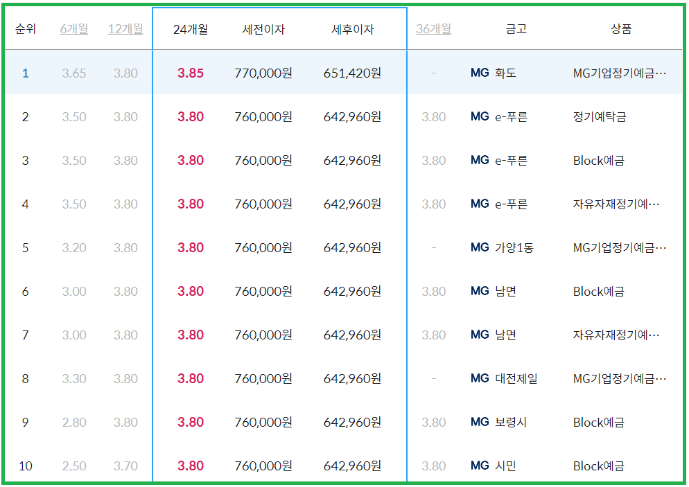 예치 기간 24개월 기준 가장 높은 금리는 3.85%인데요. 화도새마을금고 묵현지점의 'MG기업정기예금 B' 상품입니다. 방문 가입만 가능하며 24개월 만기 후 651,420원을 수령하시게 됩니다.