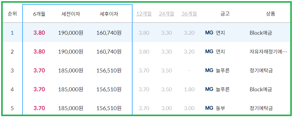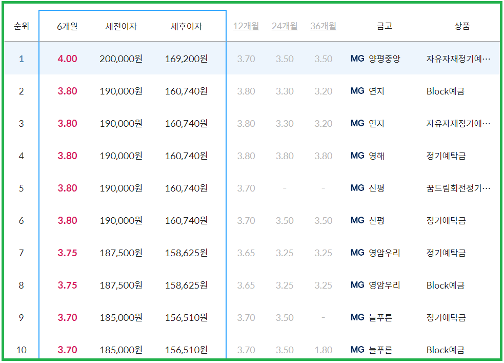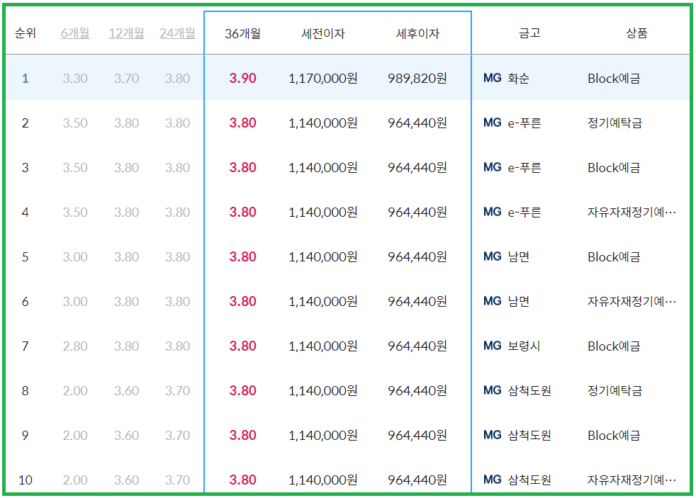 그렇다면 6개월~36개월에 해당하는 정기예금 금리와 상품 및 금고명은 어떻게 되는지 다음 목차에서 알아보도록 하겠습니다.