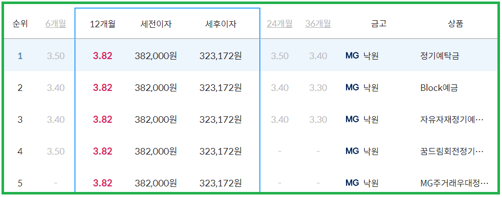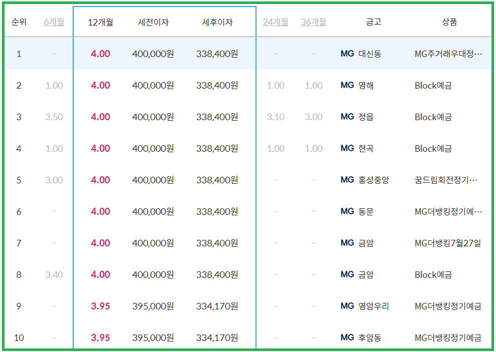 대신동새마을금고 본점(MG주거래우대정기예금), 영해새마을금고 본점(Block예금), 정읍새마을금고 수성지점(Block예금), 현곡새마을금고 푸르지오지점(Block예금), 홍성중앙새마을금고 서부지점(꿈드림회전정기예탁금), 동문새마을금고 본점(MG더뱅킹정기예금), 금암새마을금고 본점(MG더뱅킹7월27일, Block예금)이 있습니다.