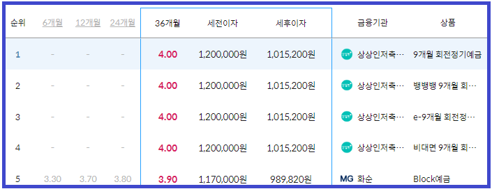 금리가 가장 높은 곳은 상상인저축은행 본점으로 금리 4.00%에 해당하며, 36개월 만기 후 1,015,200원을 수령하시게 됩니다.