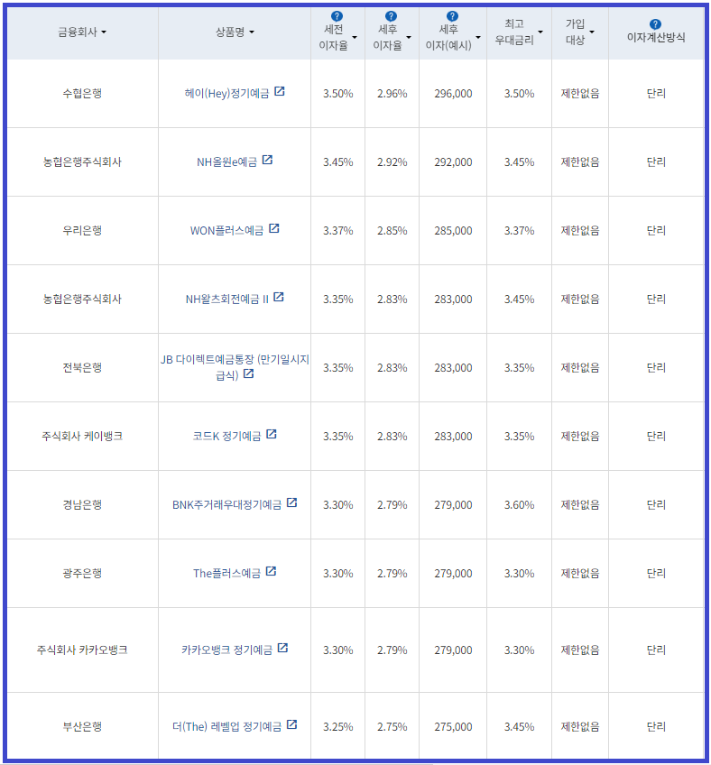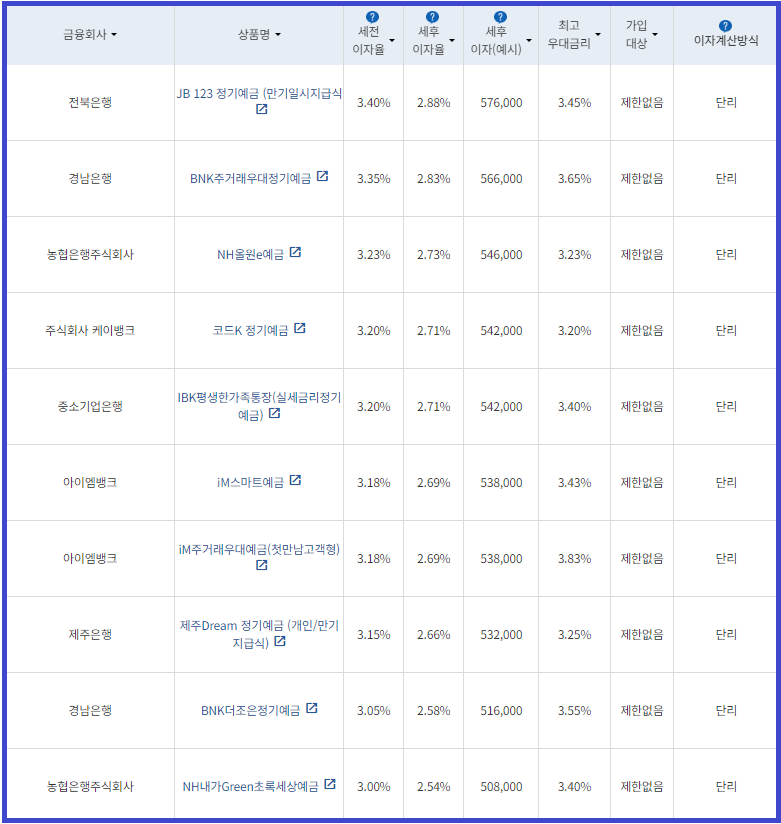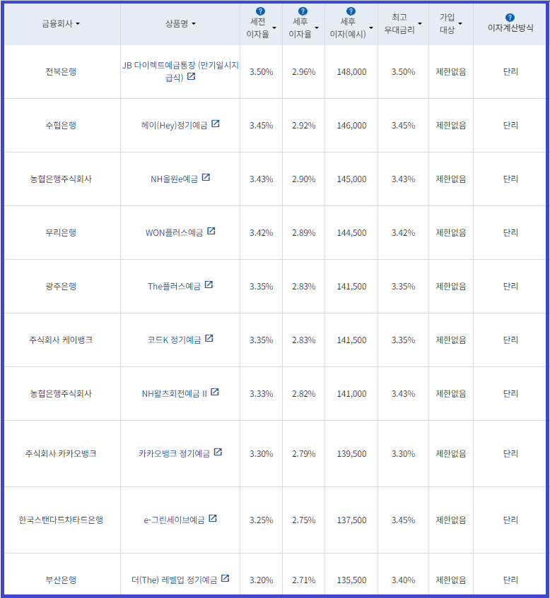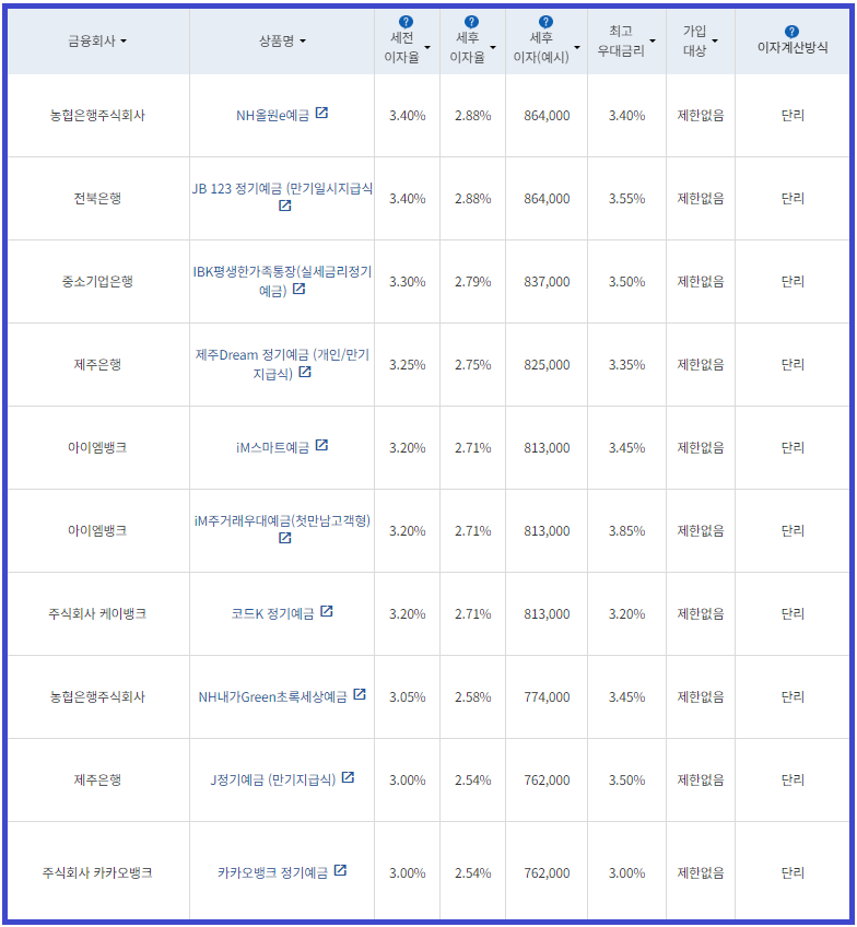 | 비대면 | [수협은행] 헤이(Hey)정기예금 [전북은행] 1. JB 다이렉트예금통장 2. JB 123 정기예금 [우리은행] WON플러스예금 [주식회사 케이뱅크] *코드K 정기예금 [주식회사 카카오뱅크] 카카오뱅크 정기예금 [농협은행주식회사] NH올원e예금 [SC제일은행] e-그린세이브예금 [경남은행] 1. BNK주거래우대정기예금 2. BNK더조은정기예금 [광주은행] 스마트모아Dream정기예금 [아이엠뱅크] IM스마트예금 [부산은행] 더(The) 레벨업 정기예금 |