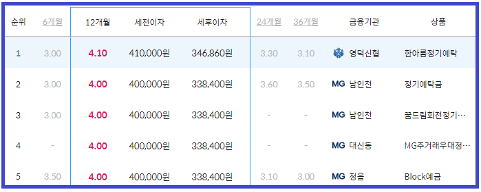 영덕신협 본점의 '한아름정기예탁' 상품이 있습니다. 금리 4.10%로 만기 후 346,860원을 수령하시게 됩니다. 이 외 금리는 4.00%인데요. 위 이미지에는 없지만 금리 4.00%에 해당하는 금융기관은 다음과 같습니다.